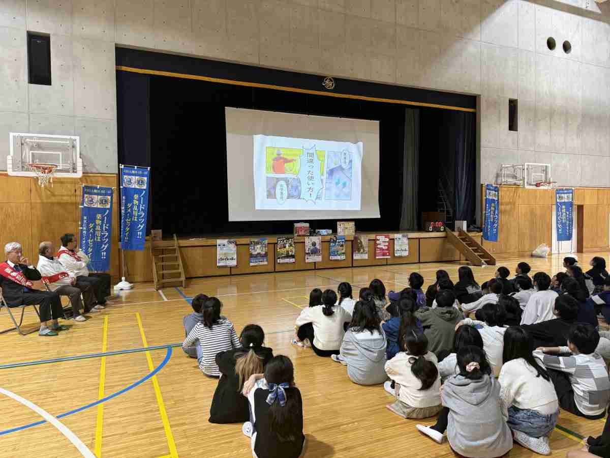 DVDを見て薬物の恐ろしさ、甘い誘いへの断り方や大麻の有害性や依存性など正しい情報を知り、自分の身は自分で守り、何かあれば友達ではなく保護者や先生、警察、病院に相談することを教えました。