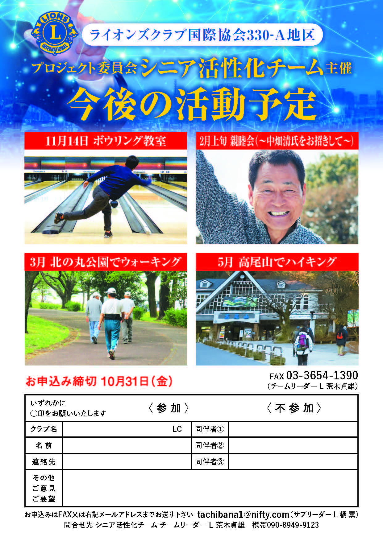 ①10/17健康麻雀大会 ②11/14ボウリング教室 ③2月上旬親睦会