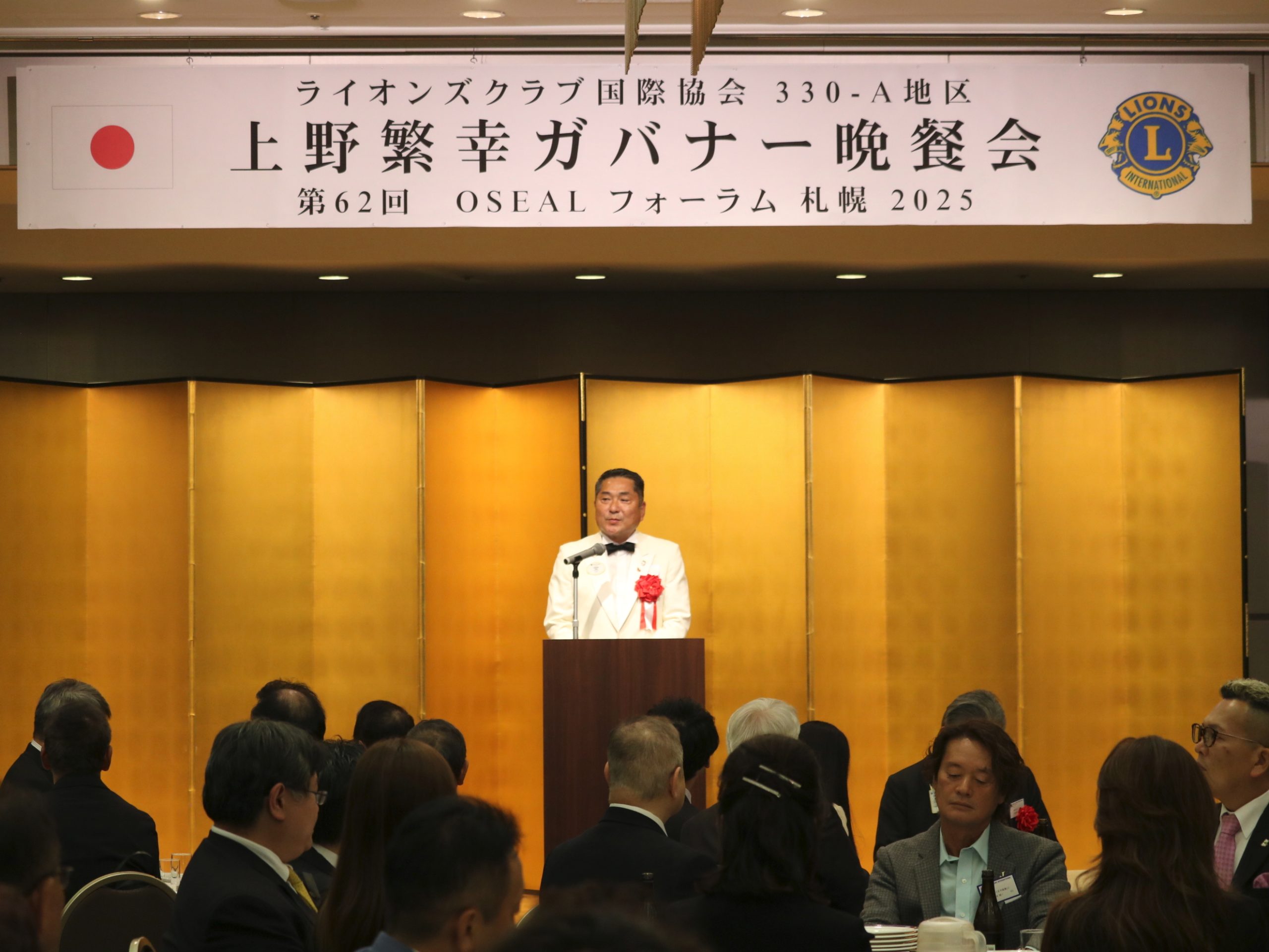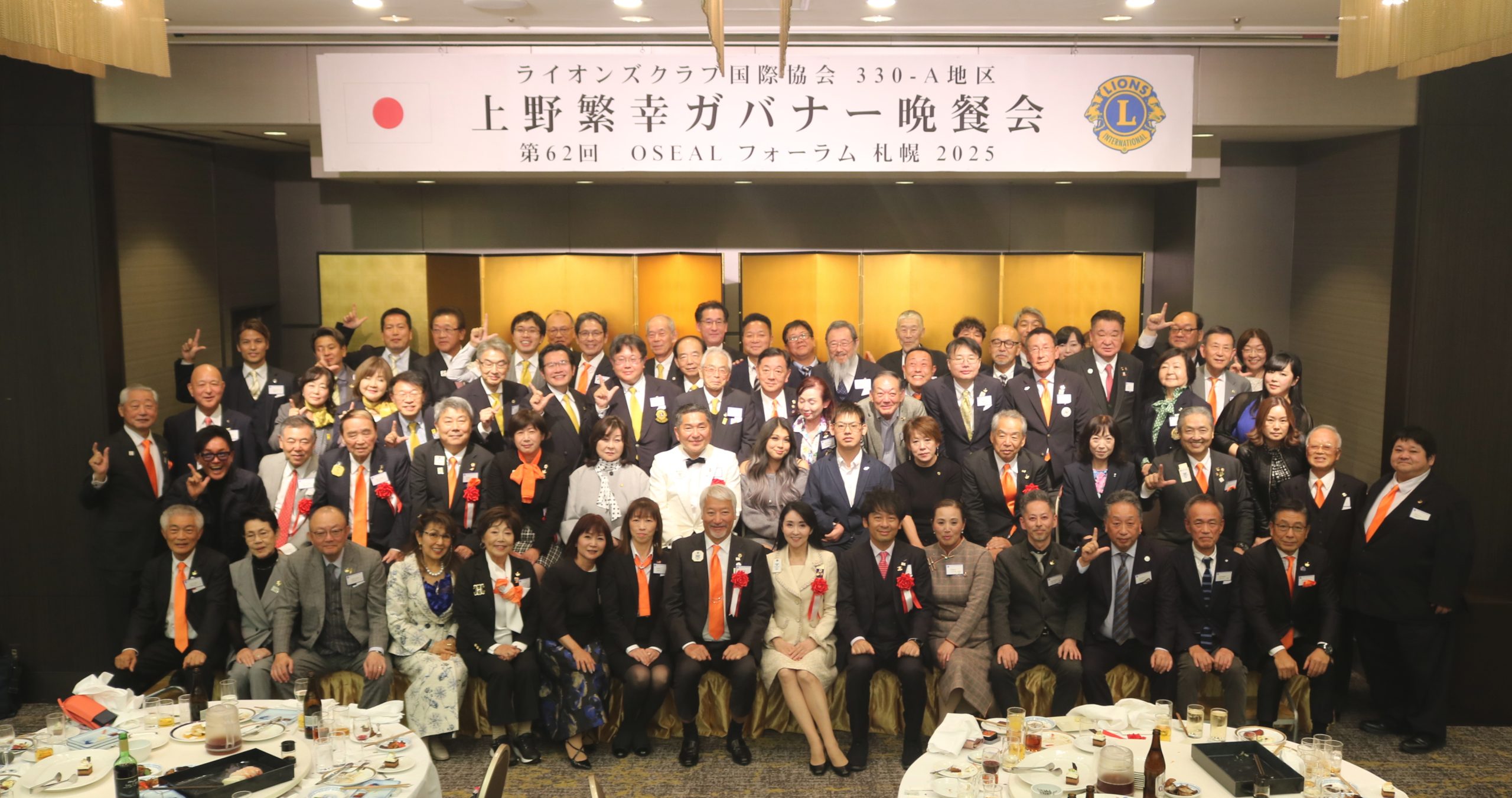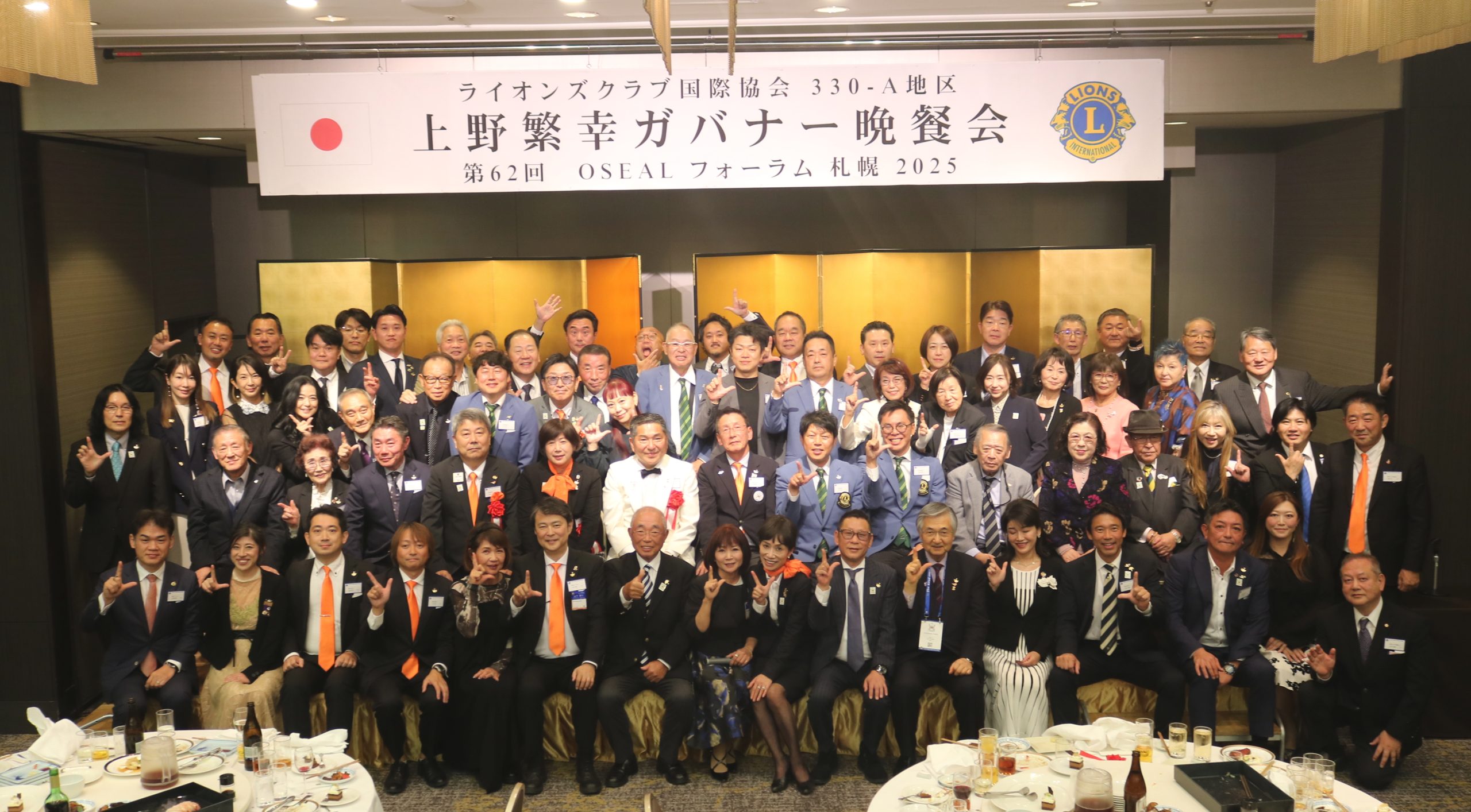 同日18時30分より「上野ガバナー晩餐会」を東急REIホテルで開催させていただきましたがこちらも委員会メンバーを含めると191名の参加者となり、どう工夫しても一回での撮影は出来ず、集合写真も2回に分けての撮影となり、嬉しい悲鳴となりました。